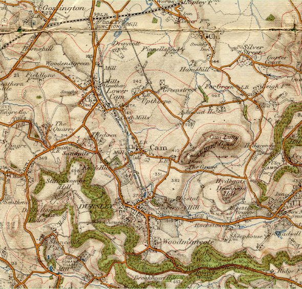 This comparatively early Ordnance Survey map demonstrates the totally rural nature of the Dursley area at the beginning of the 20th century. There is no significant development off the main tributaries into the town, Uley Road, Woodmancote and Kingshill Road and everything is concentrated very much in the town centre area. Cam and Dursley have completely distinct identities although connected by the Dursley branch of the Midland Railway which is shown making its way to Long Street from Coaley Junction, passing as it does, the mills along the Cam valley. Other items of note include the Workhouse in the Boulton Lane area and