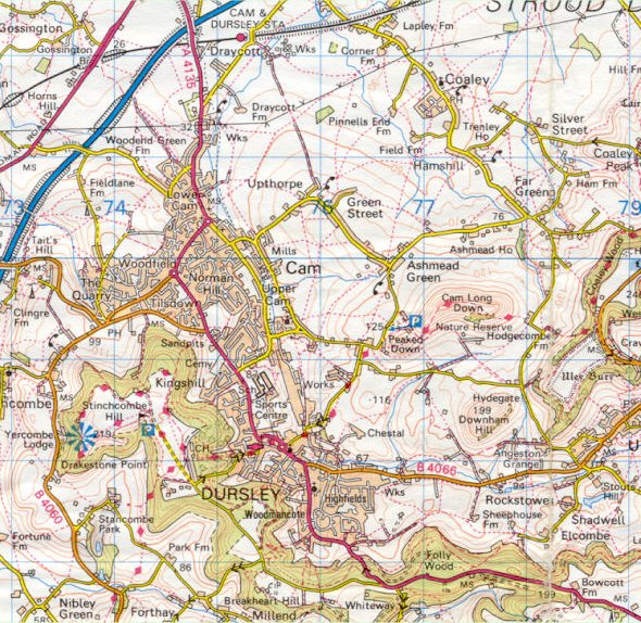 Reproduced by kind permission of Ordnance Survey. © Crown Copyright NC/02/3723. Development on a large scale is the order of the day, with new building showing in the Boulton Lane/Henlow Drive area and on Yellow Hundred, Ewelme Close and St. George's Road. In Cam, most of Tilsdown, Norman Hill and the Manor Avenue localities are built up and Cam & Dursley Railway Station is shown as open on the main Bristol to Gloucester line. |