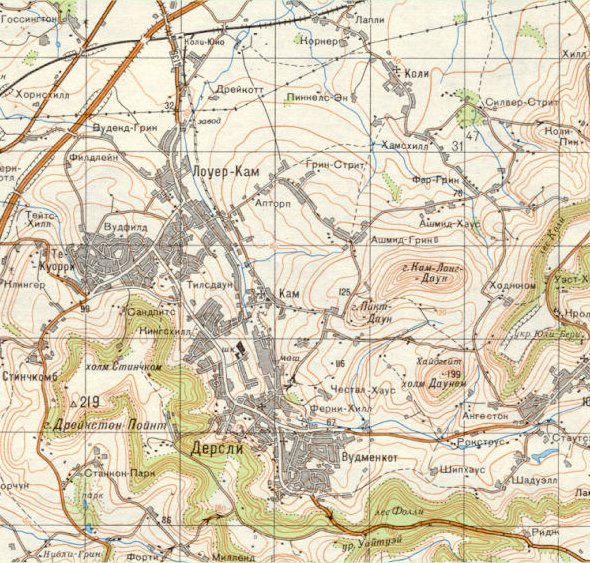 This map makes fascinating viewing as it presents a view of a familiar area in a guise which is totally unfamilar, through the eyes of what was then a foreign enemy. Following the Second World War, the Soviets put enormous effort into mapping potential enemy territory and this demonstrates the lengths to which they went. Mapping was to a very high standard, in colour with cyrillic script and all were extremely accurate, often containing sensitive information which was lacking from domestic versions. The maps were produced in the early 1980s before the breakup of the Soviet Union and conform to the usual Warsaw Pact specification for military topographic maps using the Krassovsky/Pulkovo system rather than the UK National Grid. They also carry the standard Gausse-Kruger military grid which would have allowed them to be used by artillery. It is sobering to think that they would have enabled the Red Army to find their way to even the smallest hamlet. One inconsistency which does appear on this map is the existence of part