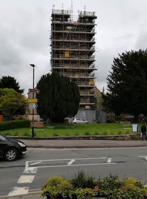 Scaffolding surrounds the tower of St. James' Church