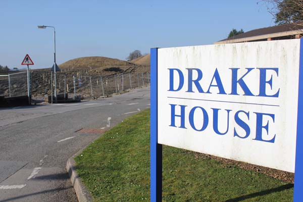 The sign for Drake House frames the entrance to the old Lister site