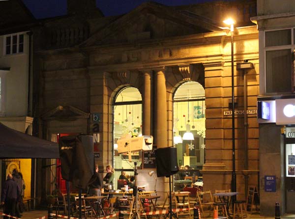 An illumininated Bank Cafe at the town's Christmas shopping event