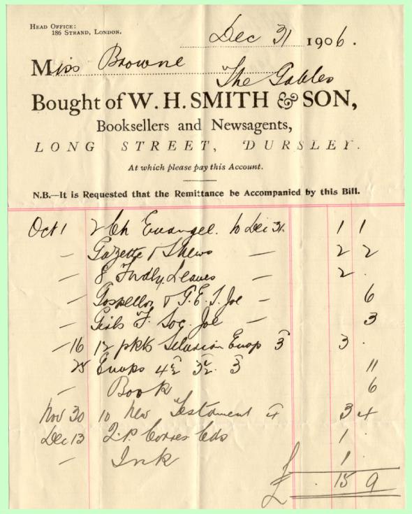 Invoice from W.H. Smith & Son, Booksellers and Newsagents